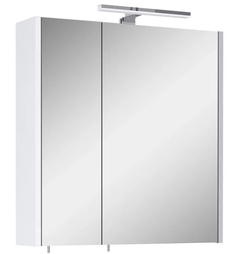 Zrcadlová skříňka z vysoce lesklé, bílé nábytkové desky, se 2 soft-close, zrcadlovými dvířky. Představuje inovaci a design v koupelně.