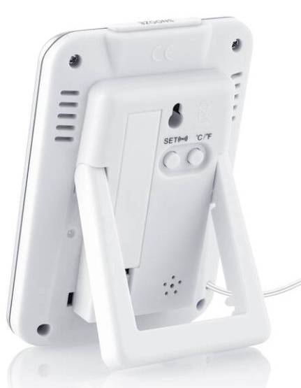 Součástí balení je 2 m kabelové čidlo, které můžete umístit například na venkovní fasádu či okenní parapet. Meteostanice navíc uchovává i naměřené extrémy obou teplot. Přístroj se napájí prostřednictvím jedné 1,5 V AAA baterie.