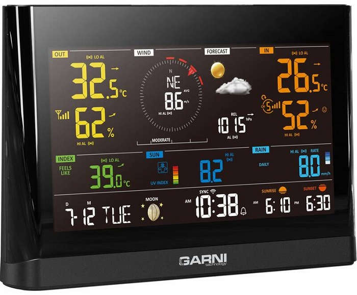 Tato meteostanice zvládá měření vnitřní teploty a relativní vlhkosti, stejně jako sledování vnější teploty a relativní vlhkosti zobrazení teploty s podporou připojení až 7 bezdrátových čidel GARNI 055H (včetně bazénové čidla pro měření teploty GARNI 057P). Meteostanice ale také zobrazí ukazatel trendu vývoje barometrického tlaku, vnitřní a vnější teploty, relativní vlhkosti, pocitové teploty, rosného bodu, teplotního indexu a Wind Chill měření průměrné rychlosti větru. Využít ale můžete i měření dešťových srážek za uplynulou hodinu, denních, týdenních, měsíčních, celkových a aktuální intenzity dešťových srážek, grafické zobrazení intenzity srážek, předpověď počasí i měření barometrického tlaku, UV indexu a slunečního záření.