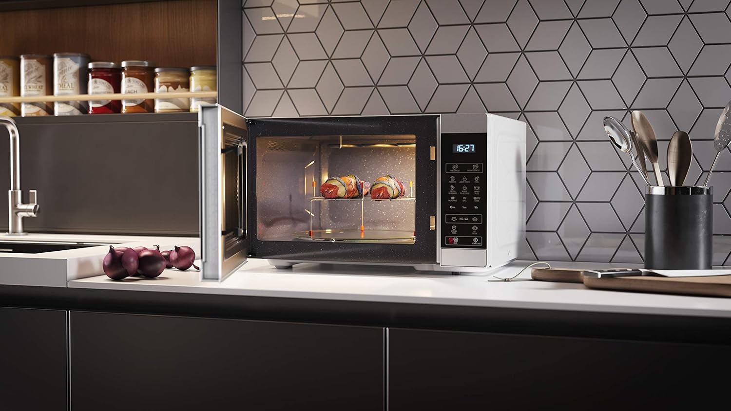 Kombinace mikrovlnného výkonu 900 W a grilu o výkonu 1100 W umožňuje nejen rychlý ohřev, ale také zapékání a grilování. K dispozici je 11 úrovní výkonu a 8 automatických programů, včetně rozmrazování podle času nebo hmotnosti. Plně digitální dotykové ovládání je přehledné a intuitivní, takže příprava pokrmů je rychlá a bez starostí.