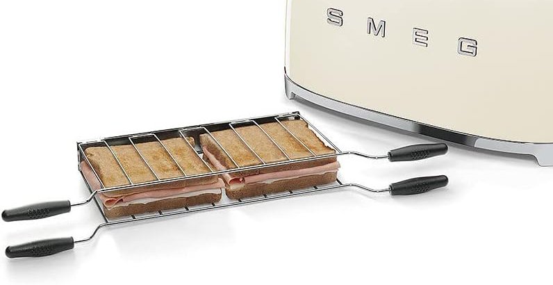 Doplňkové příslušenství k topinkovačům Smeg se 2 dlouhými zdířkami na 2 tousty (typ 4 x 2), díky kterému si připravíte obložené sendviče z libovolného druhu pečiva a nemusíte se bát, že plátky uzenin nebo sýru propadnou dovnitř přístroje.