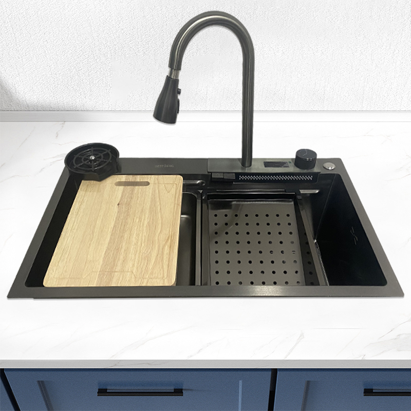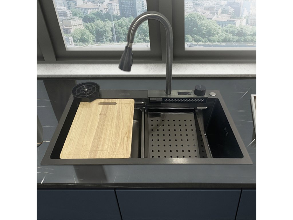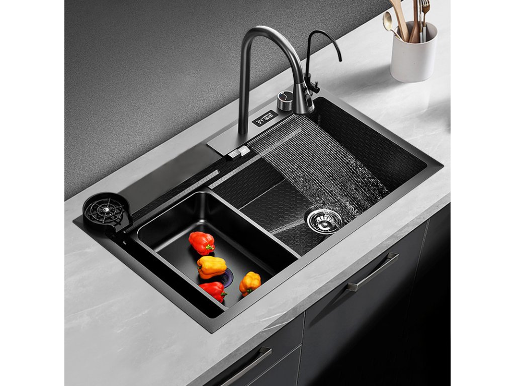 Multifunkční chytrý dřez je moderní kuchyňský dřez, který kombinuje několik funkcí a technologií, aby usnadnil a zefektivnil práci v kuchyni. Tento multifunkční dřez je navržen tak, aby byl nejen praktický, ale také esteticky přitažlivý. V černé povrchové úpravě přinesete do své kuchyně kombinaci inovace a elegance a užijete si každodenní činnosti s radostí a pohodlím. Nerezová ocel SUS 304 má vynikající odolnost vůči korozi, udržuje si svou pevnost a odolnost i při vysokých teplotách a je odolná vůči mechanickému namáhání. Díky panelu proti vodnímu kameni je nádobí a dřez snadněji udržovatelný, protože zabraňuje tvorbě tvrdé minerální usazeniny.