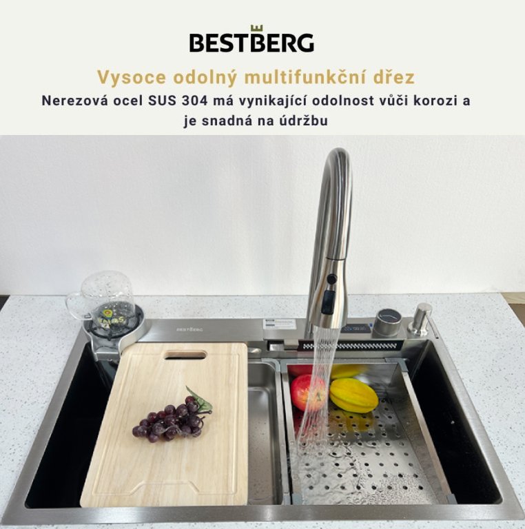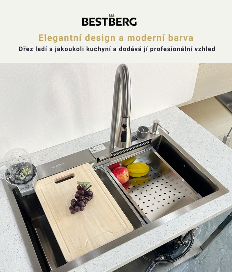 Multifunkční dřez BestBerg spojuje moderní design s chytrými funkcemi. Usnadňuje práci v kuchyni a šetří váš čas.