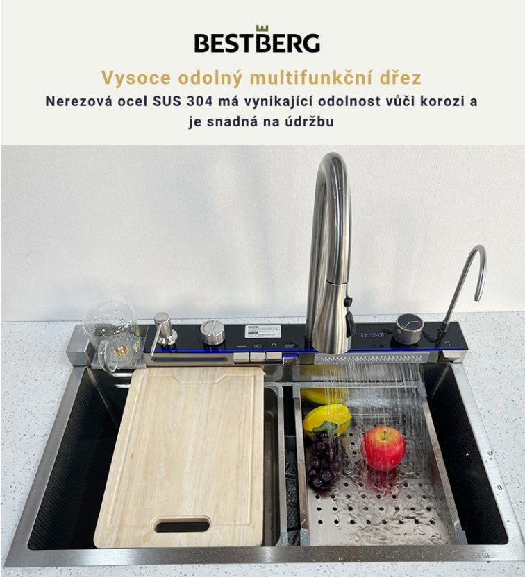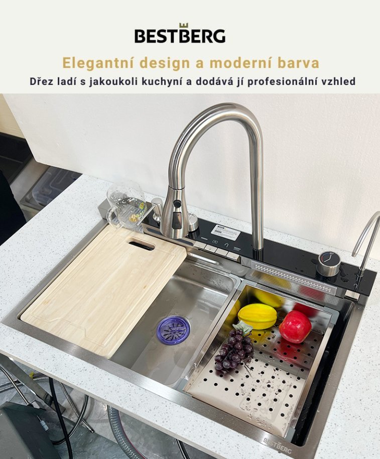 Vždy něco navícMultifunkční dřez BestBerg spojuje moderní design s chytrými funkcemi. Usnadňuje práci v kuchyni a šetří váš čas.