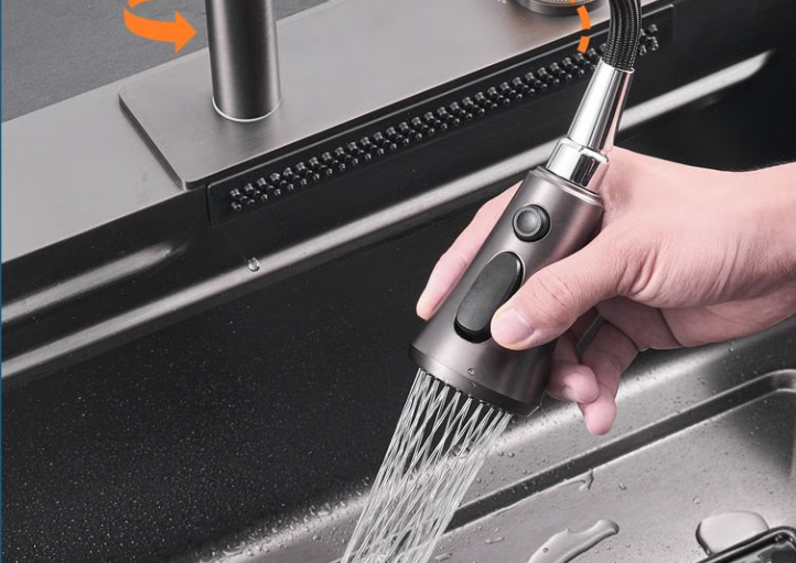 - Sprcha s vytahovací hlavicí nabízí snadné dosažení všech koutů dřezu. To usnadňuje jeho čištění.