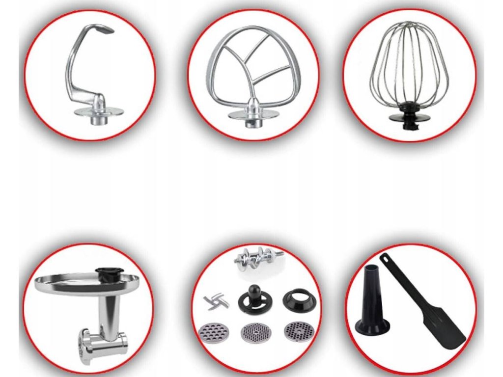 - Měchačka, hák na těsto a metla. Od vzdušných lehkých krémových hmot až po těžké koláče nebo chlebová těsta, všechny konzistence budou dokonale ušlehány a uhněteny
