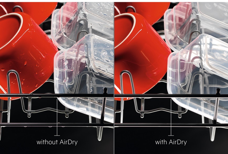 Automatické otevírání dvířek AirDry přináší efektivní sušení díky cirkulaci vzduchu a snižuje náklady na energie. Před koncem mycího programu se dvířka pootevřou na 10 cm, vzduch se dostane dovnitř a nádobí je rychle suché bez zaschlých kapek.