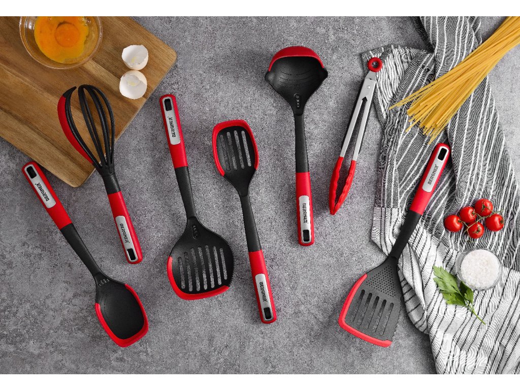 Naběračka na omáčku s výlevkou Bergner se vyznačuje ergonomickým tvarem a skvělou bimateriálovou technologií, která kombinuje pružnost silikonu s antibakteriálními vlastnostmi nylonu. Dokonalá kombinace materiálů chrání vaše nádobí před poškrábáním. Černé provedení s malými červenými detaily je vhodné pro ty nejodvážnější kuchaře. Ergonomická rukojeť nabízí perfektní a bezpečný úchop. Na konci předmětu je malý otvor sloužící k zavěšení.