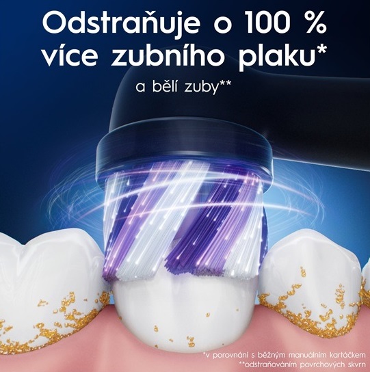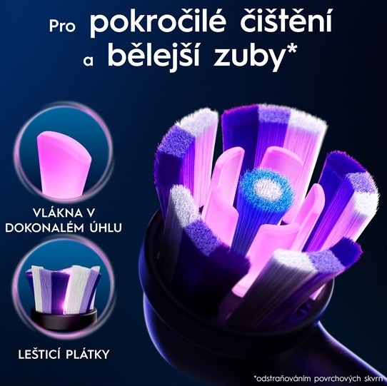 Dopřejte svým zubům profesionální péči. Hlavice odstraní zbytky jídel, skvrny a dásně zůstanou v bezpečí. Kartáček efektivně směřuje sílu do jednotlivých vláken v hlavici.