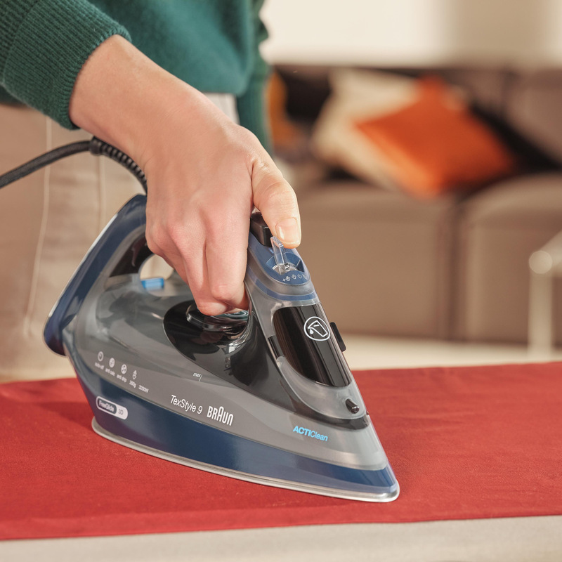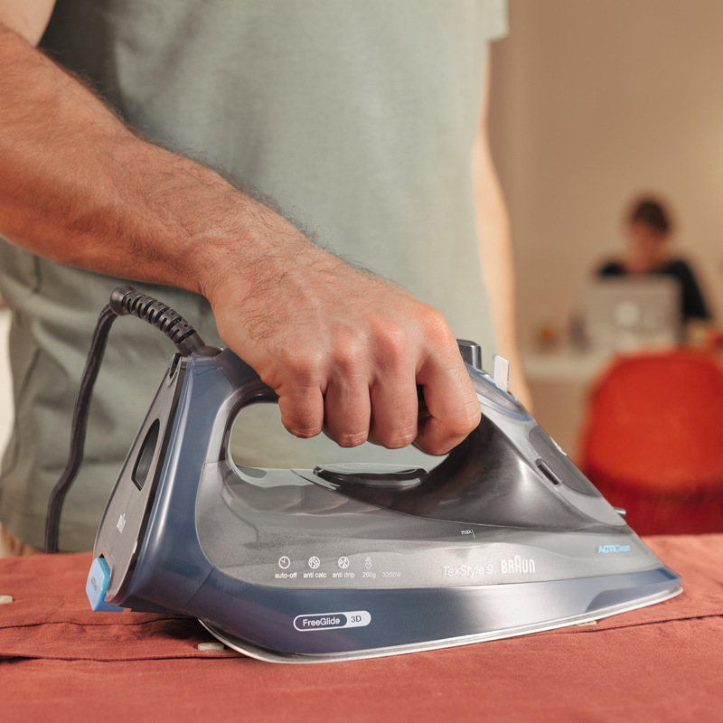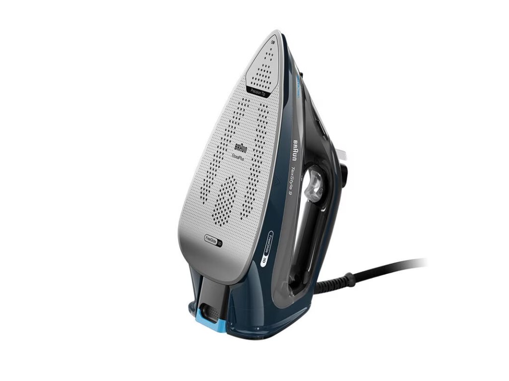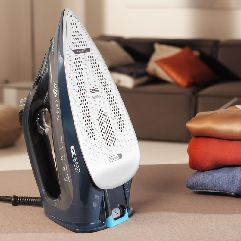 Napařovací žehlička Braun TexStyle 9 SI9682DB disponuje silným výkonem 3 200 W a řadí se tak k nejvýkonnějším žehličkám na trhu. Jako první na světě je vybavena technologií FreeGlide 3D pro žehlení všemi směry. Nový odvápňovací systém ActiClean chrání před vodním kamenem s účinností až 100 % a prodlužuje tak životnost žehličky. Technologie iCare chrání vaše oblečení díky nastavení bezpečné teploty pro jakýkoliv materiál. Parní ráz dosahuje 260 g/min. a variabilní pára 60 g/min.