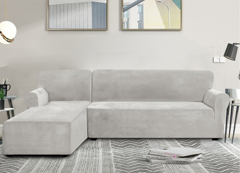 Napínací elastický plyšový potah na trojmístnou rohovou pohovku BestBerg / levá / světle šedá