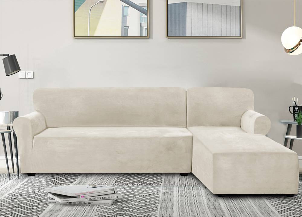 Napínací elastický plyšový potah na trojmístnou rohovou pohovku BestBerg / pravá / krémová