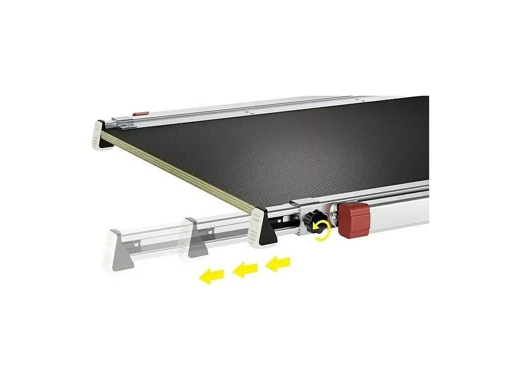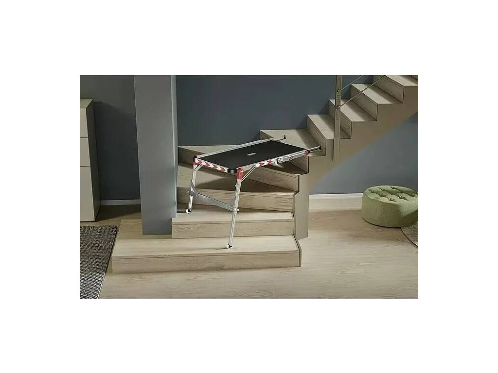 Pracovní plošina Hailo TP Plus je vhodná pro venkovní i vnitřní použití je inovativním a bezpečným řešením pro práci na schodech nebo na schodištích. Délku plošiny lze nastavit mezi 100-120 cm, výšku protiskluzových nohou mezi 54-80 cm. Snadno se skladuje, ve složeném stavu má tloušťku pouhých 6 cm.
