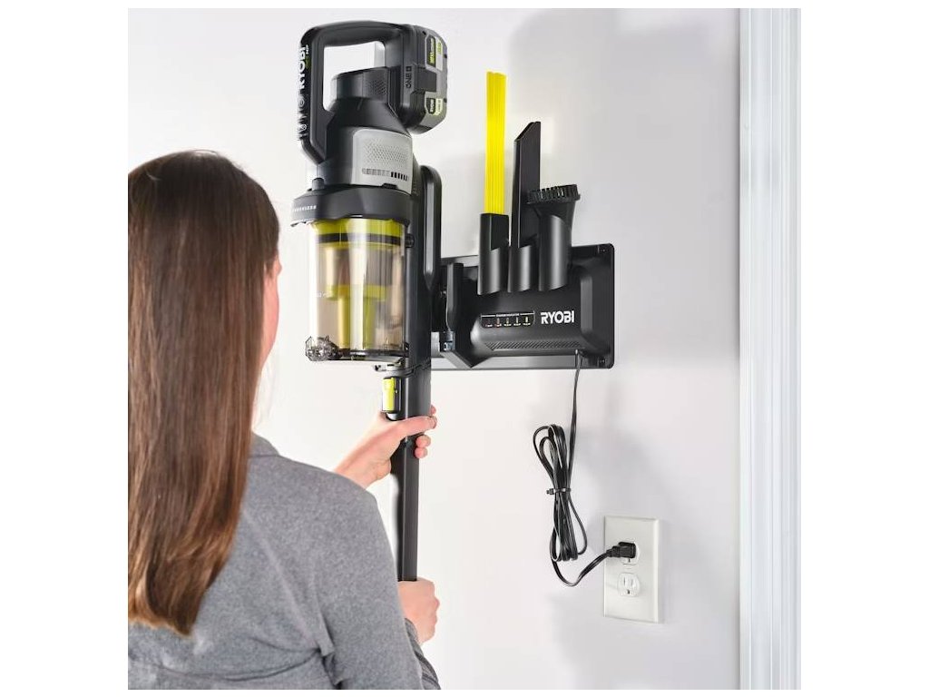 Kompaktní konstrukce nabíječky umožňuje snadné umístění doma, v dílně nebo úklidové místnosti, aniž by zabírala zbytečně mnoho prostoru. Kvalitní zpracování odpovídá standardům značky RYOBI a zajišťuje dlouhodobou spolehlivost při pravidelném používání. Připojení vysavače je jednoduché a intuitivní.