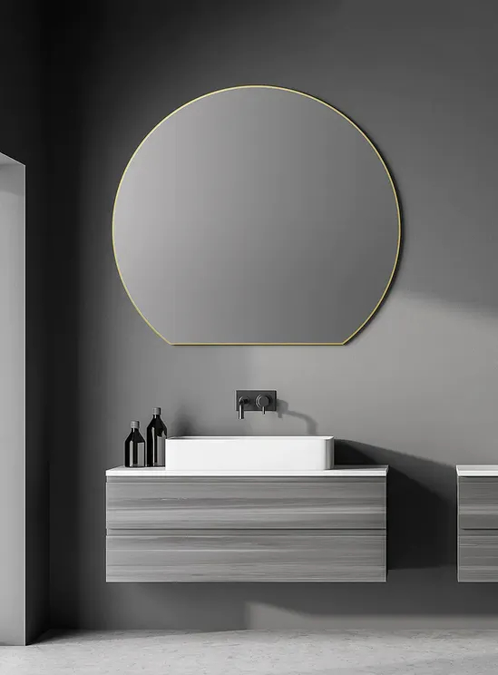 Rám v elegantním zlatém provedení podtrhuje noblesu a nadčasový charakter tohoto doplňku. Jeho tenký, ale pevný profil zvýrazňuje moderní čisté linie a zároveň poskytuje maximální plochu zrcadlení. Sklo je precizně broušené a zajišťuje jasný, nerušený odraz, který přirozeně rozjasní a opticky zvětší prostor.