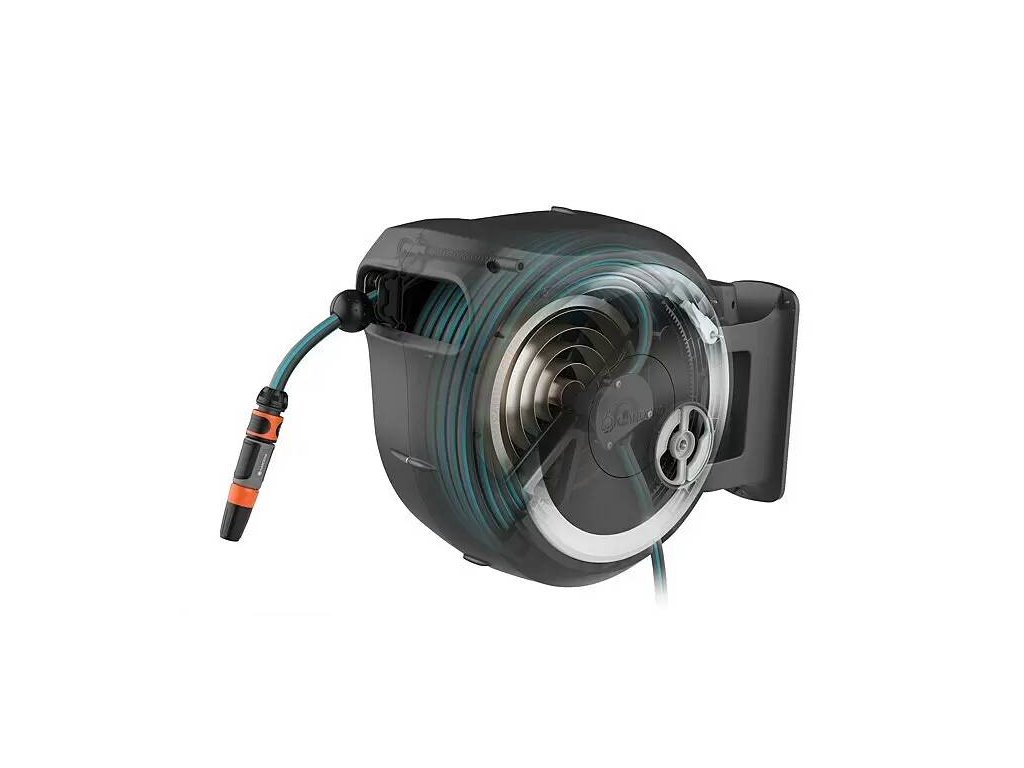 Nástěnný box na hadici RollUp L, včetně 30 m hadice od společnosti Gardena výrazně usnadní manipulaci se zahradní hadicí při zalévání. Box na hadici je napevno namontovaný na stěnu domu a připojen k vodovodnímu kohoutku. Díky nástěnnému držáku lze box otočit o 180°. Díky pohyblivosti má mimořádně velký rozsah působení a zabraňuje zasukování hadice. Hadici jednoduše vytáhnete a díky zvláště krátkým aretačním zarážkám se automaticky zafixuje v požadované délce, když zastavíte. Jakmile je zavlažování ukončeno a zámek se mírným zatažením uvolní, integrovaná pružina automaticky a spolehlivě zavine zahradní hadici. Díky inovativní technologii RollControl je zatahování obzvláště bezpečné a jednoduché.