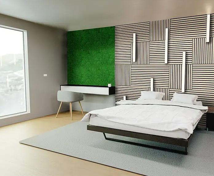 Panely spojují krásu přírodního mechu s praktickými vlastnostmi. Recyklovaný PET materiál zajišťuje odolnost, zatímco povrch z přírodních vláken zlepšuje akustiku a mikroklima místnosti. Váš prostor tak nejen krásně vypadá, ale je i klidnější a příjemnější.