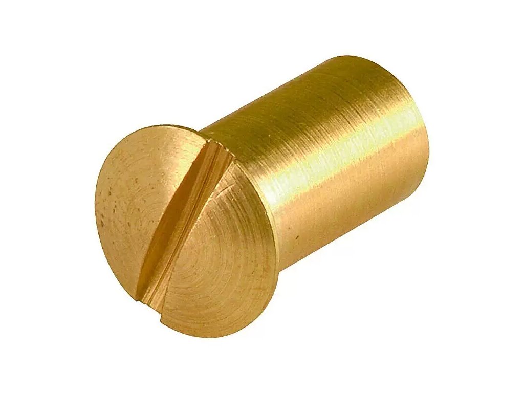 Matice s čočkovou hlavou a drážkou je ideální pro upevnění krátkých cedulí na dveře. Je vyrobena z lesklé mosazi s povrchem z nerezové oceli.