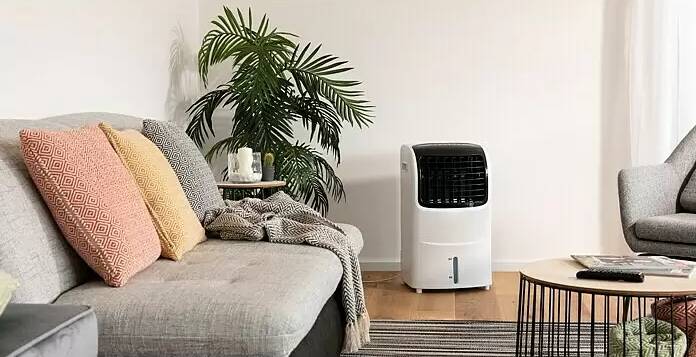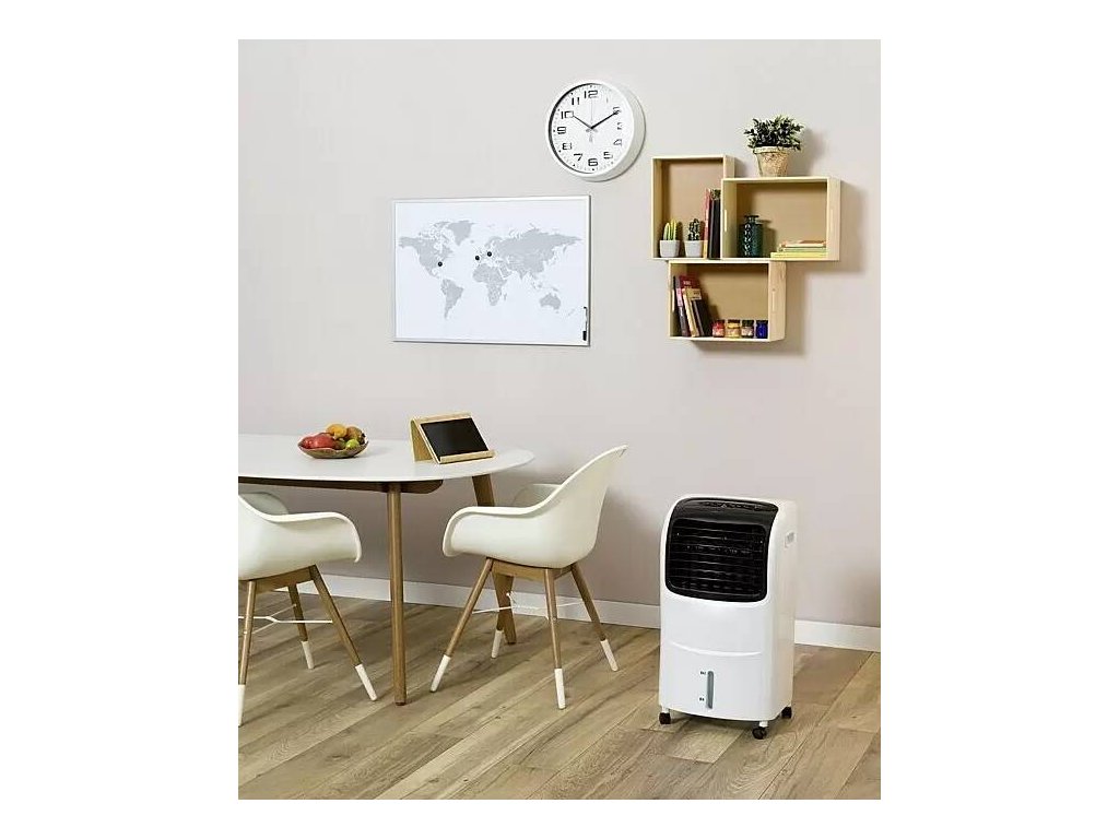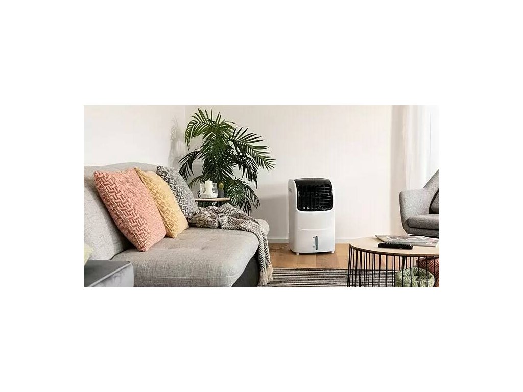Ochlazovač vzduchu je perfektním doplňkem do vašeho bytu nebo domu, když je vedro nesnesitelné. Poskytuje příjemně vychlazenou místnost a díky ventilačním štěrbinám v úzkém přístroji je vzduch distribuován na velkou plochu. Díky 4 kolečkám je dokonale přenosný a lze jej umístit kamkoli si budete přát. Integrovaná nádrž na vodu má kapacitu 10 litrů, jejíž obsah lze kontrolovat pomocí ukazatele hladiny. Kromě toho má ochlazovač vzduchu také 3 rychlostní stupně, volitelný provozní režim a časovač na 7,5 hodiny, který lze regulovat podle nastavení. Ochlazovač vzduchu je dodáván také s dálkovým ovládáním, takže jej můžete snadno ovládat z postele nebo pohovky, aniž byste museli vstávat.