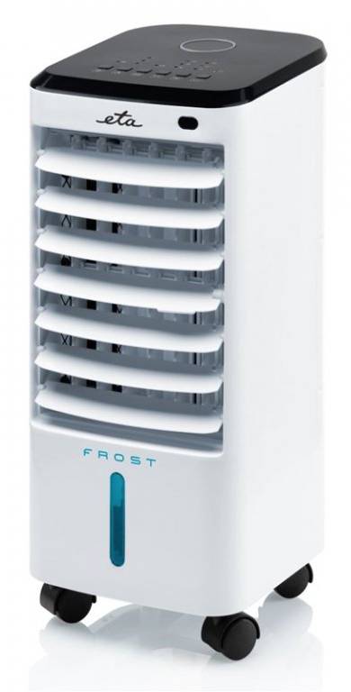 Ochlazovač vzduchu ETA Frost nabízí dostatečný výkonpro ochlazení místnosti o rozloze 20 m2a přesto nezabere příliš prostoru. Je možné také využít pouze provoz samotného ventilátoru nebo funkci zvlhčování vzduchu. Maximálního komfortu dosáhnete pomocí3 rychlostí ventilace a 3 režimů proudění vzduchu. Úhel sklonu ventilačních lamel a tím pádem také proud vzduchu lze usměrnit dle přání.