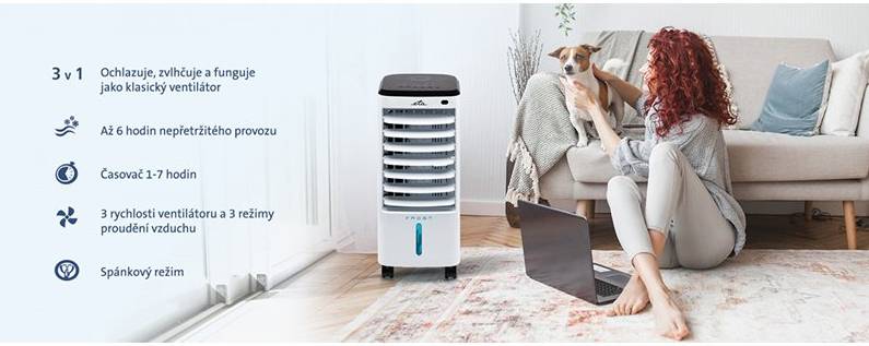 Nabízí3 funkce– chlazení, ventilaci a zvlhčování vzduchu
