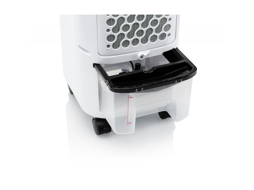 Ochlazovač funguje naprincipu odpařování vodya poskytuje až6 hodin nepřetržitého provozu.Kapacitazásobníkuna vodu dosahuje3,5 l. Díkyukazateli hladiny vodyv nádržce vždy vidíte, zda je dostatečně naplněna. K ovládání slouží panel v horní části, případnědálkový ovladač.Tři rychlosti ventilátoruatři režimyproudění vzduchuumožňují zvolit si tu nejvýhodnější variantu včetně imitace přírodního vánku.