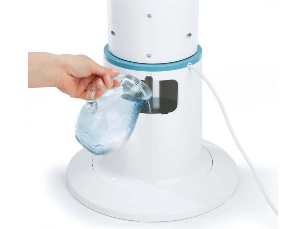 Zařízení pracuje na principu odpařování vody, bez nutnosti drahých chladiv. Čtyři chladicí kazety ochlazují vodu v XL nádrži o objemu 5 litrů a jemná mlha je rovnoměrně rozptylována do prostoru. Díky tomu dosahuje chladič až 24 hodin provozu a s funkcí oscilace v úhlu 60° zajišťuje rovnoměrné proudění vzduchu po celé místnosti.