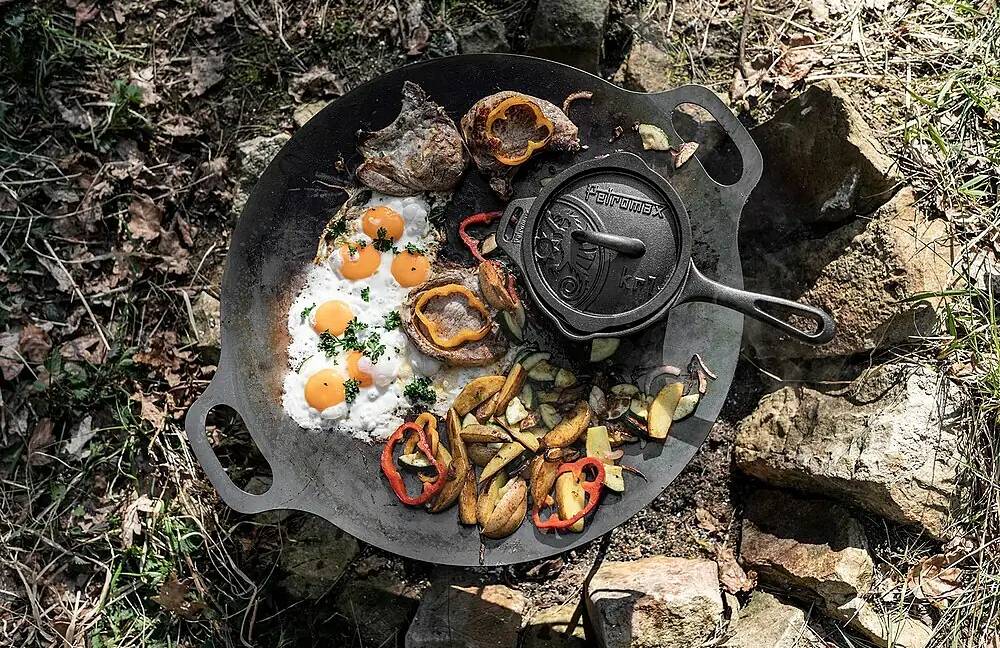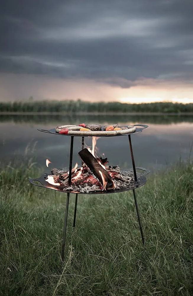 Po prvním „vyvytvrzení patiny“ se povrch sám stává nepřilnavým, takže je misku možné použít i jako grilovací plát, na kterém připravíte maso, zeleninu nebo vejce přímo nad ohněm. Variabilní použití jako ohniště či gril dodává tomuto kusu vysokou flexibilitu – stačí jen doplnit dřevo a pustit se do přípravy pokrmů nebo udělat teplé večerní posezení u ohně.