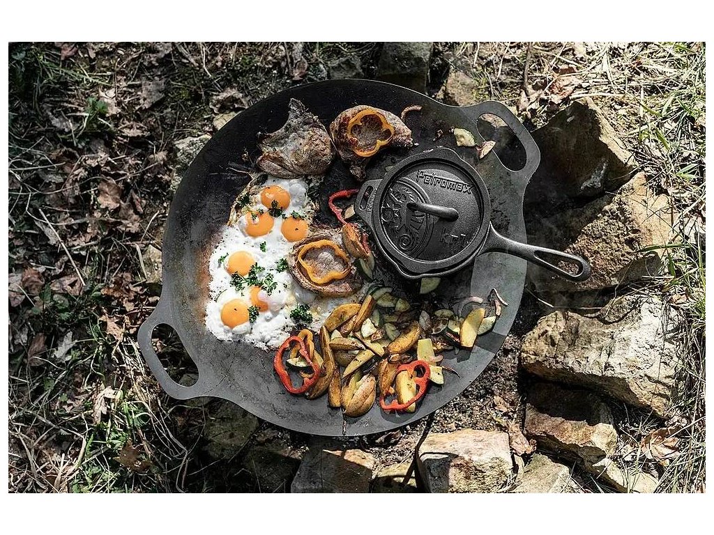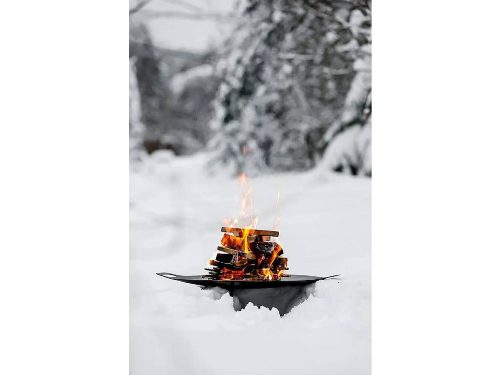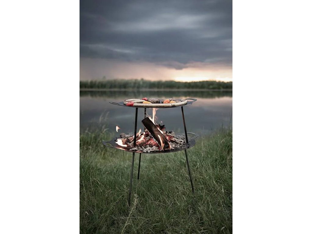 Po prvním „vyvytvrzení patiny“ se povrch sám stává nepřilnavým, takže je misku možné použít i jako grilovací plát, na kterém připravíte maso, zeleninu nebo vejce přímo nad ohněm. Variabilní použití jako ohniště či gril dodává tomuto kusu vysokou flexibilitu – stačí jen doplnit dřevo a pustit se do přípravy pokrmů nebo udělat teplé večerní posezení u ohně.