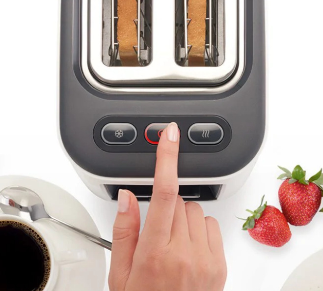 V horní části topinkovače jsou k dispozici 3 tlačítka pro funkce ohřívání, zastavení a rozmrazovaní. S funkcí rozmrazování chléb rozmrazíte rovnoměrně. Ohřívání využijete na ohřev již opečeného chleba a s funkcí „Stop“ lze přípravu kdykoli přerušit.