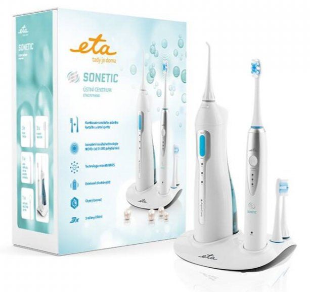 Praktická sada od společnosti ETA vám pomůže udržovat zuby zdravé a krásné, bez plaku a kazů. Balení obsahuje sonický zubní kartáček a ústní sprchu; jejich společným pravidelným používáním dosáhnete viditelně lepších výsledků. Oba pomocníci orálního centra ETA Sonetic 2707 90000 v sobě mají zabudovanou Li-ion baterii s mimořádně dlouhou výdrží, stačí je jen postavit na nabíjecí stojan a nechat dobít.