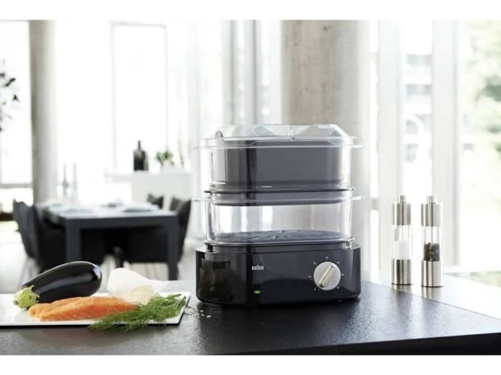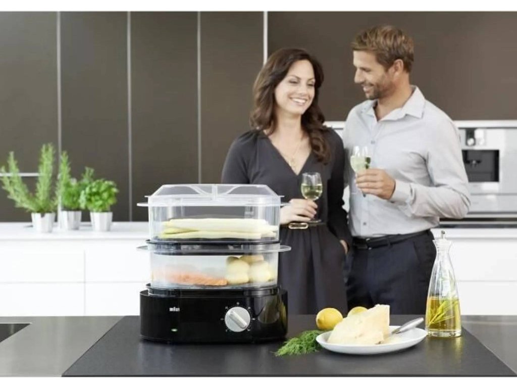 Parní hrnec Braun FS5100BK je moderní kuchyňský pomocník určený pro zdravé a rychlé vaření. Díky výkonu 850 W a celkovému objemu 6,2 litru umožňuje pohodlně připravit více porcí najednou. Je vyroben z kvalitního plastového materiálu v kombinaci transparentního a černého provedení, takže snadno zapadne do každé moderní kuchyně. Vaření v páře zachovává přirozenou chuť a živiny potravin, což ocení každý, kdo si potrpí na vyváženou a zdravou stravu.