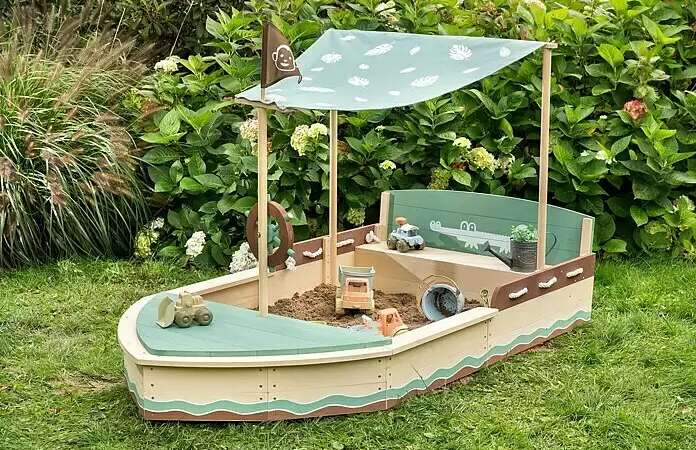 Pískoviště Muddy Buddy Loď s mušlemi / 195 x 110 x 120 cm / sedací plochy / úložné prostory / světlé dřevo