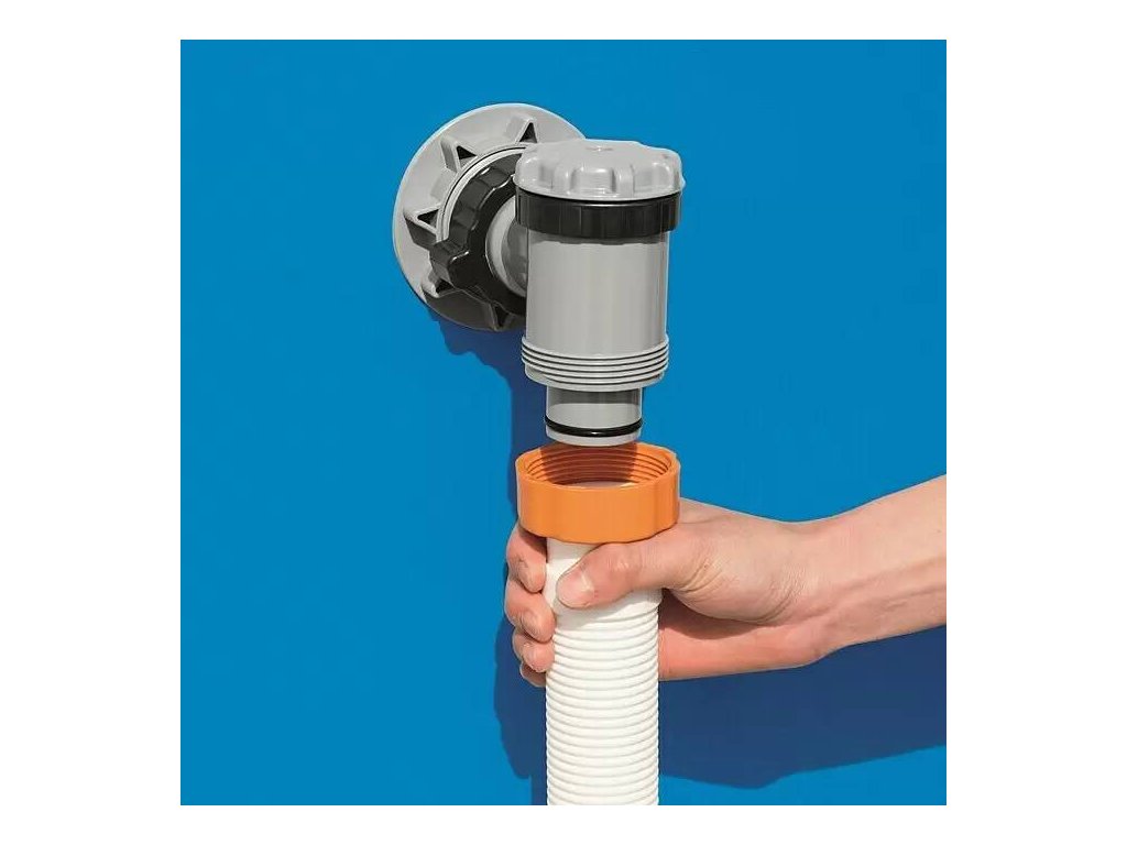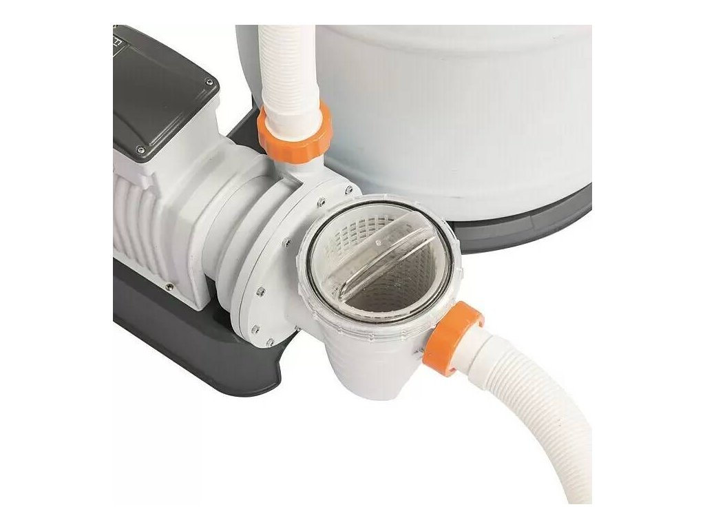 Čerpadlo s předfiltrem nabízí cirkulační výkon 11 355 l/h. Filtrační nádobu lze naplnit 55 kg písku a je vhodná pro všechny standardní bazény s hadicovou přípojkou 38 mm s adaptérem na 32 mm. U tohoto filtračního systému je možné i plnění filtračními kuličkami .