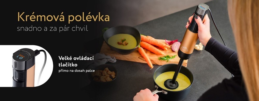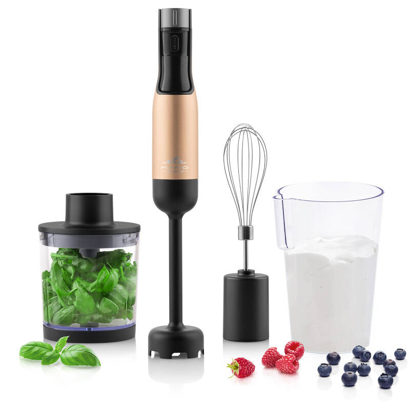 Ponorný mixér ETA Mano 3219 90020 v nádherném metalickém designu vás nezklame při žádném úkolu v kuchyni. Ať už se chystáte připravit krémové polévky, skvělé smoothie, dokonalou šlehačku, nebo nasekat ořechy, poradí si se vším! Jeho skvělý výkon zaručí silný 1 000W DC motor spolu s extrémně ostrým titanovým čtyřramenným nožem Blende X. Není to ale jen výkon, kterým ETA Mano 3219 90020 vyniká. Je to i jeho moderní LCD displej se kterým budete mít celý proces přípravy pod kontrolou. Také bohaté příslušenství, díky kterému se můžete pustit do mixování, šlehání i sekání. A ergonomická rukojeť zaručí, že se vám bude mixér pohodlně držet i při delší práci v kuchyni.