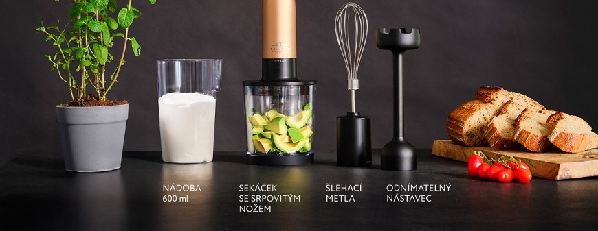 - Funkce, příslušenství - mixování, sekací nástavec (chopper), šlehání, mixovací nádoba