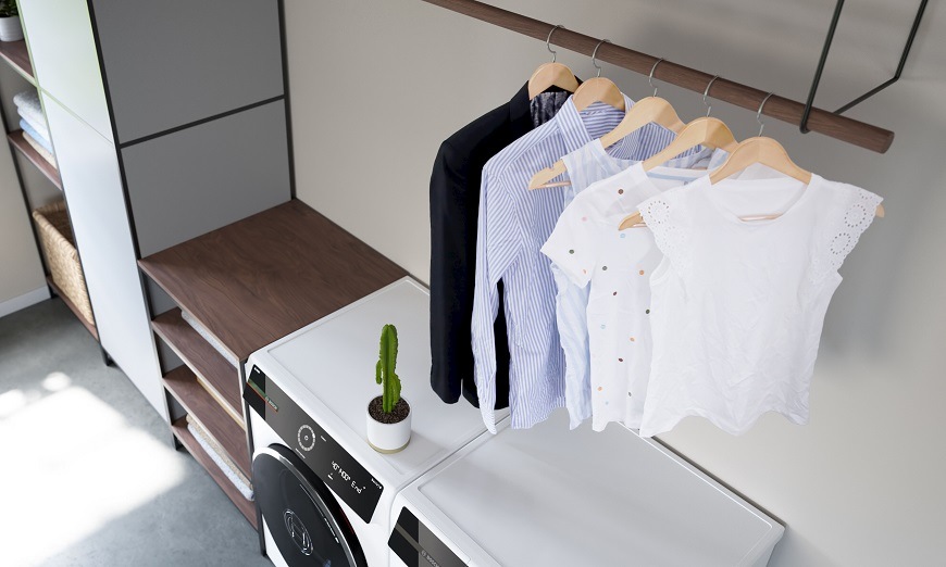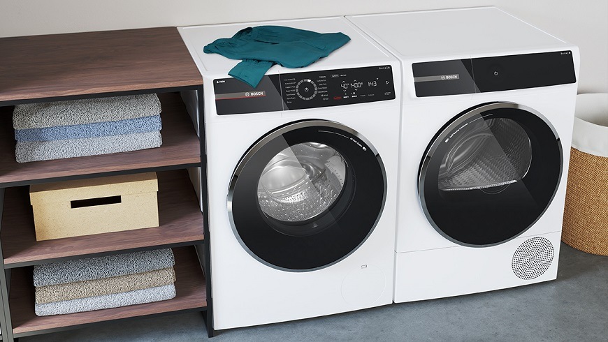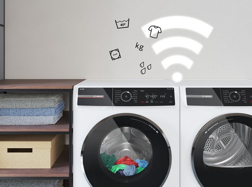Pokud máte pračku i sušičku Serie 8, propojte je mezi sebou pouze díky připojení Wi-Fi. Sušicí program se poté automaticky nastaví na základě informací o posledním pracím programu (množství prádla, jeho zbytková vlhkost, zvolený program).