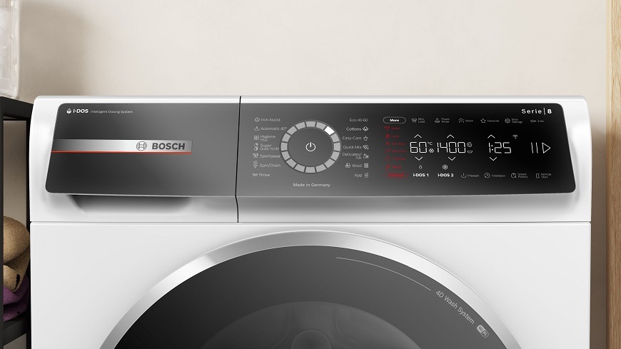 Nový design pračky Bosch s nakloněným panelem přináší moderní ovládání chytrého spotřebiče. Program navolíte jednoduše pouhým dotykem na zvýrazněném LED prstenci. Zvolený program svítí jasně. Na panelu si snadno zvolíte i další doplňkové programy.