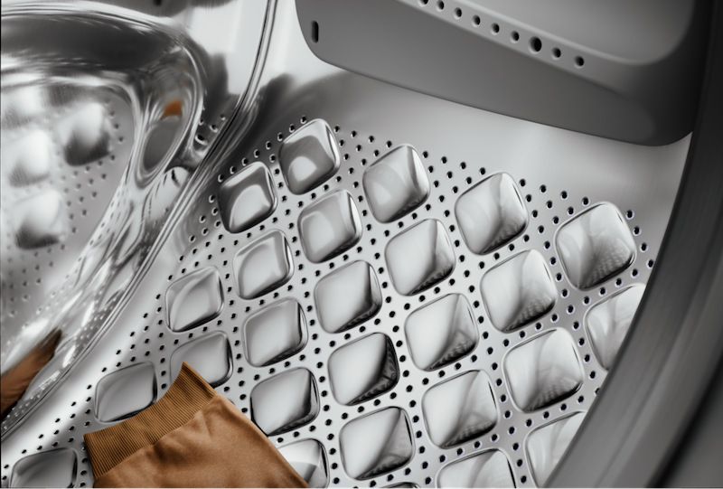Ještě šetrnější péče o vaše oblečení díky hladkému povrchu bubnu s vylepšeným vzorem. Speciální design bubnu vytváří tenký film vody, který zakrývá otvory během praní.