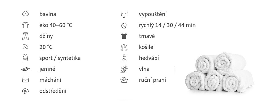 Na výběr budete mít z 15 přednastavených programů, které si můžete vybrat pomocí elektronického displeje s ovládacím panelem v češtině. Programy jsou navrženy tak, aby vyhovovaly vašim nejčastějším potřebám. Najdete mezi nimi například rychlé praní za 15 minut nebo úsporný EKO program, jenž optimalizuje spotřebu vody. Na funkční prádlo použijte program SPORT. Nechybí ani program určený pro džíny, bavlnu, košile, hedvábí či jemné prádlo.