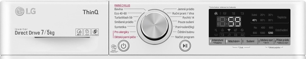 Kromě klasické péče o bavlnu, syntetiku a smíšené prádlo mezi nimi najdete programy pro vlnu a jemné oblečení. Pro větší úsporu použijte ECO 40–60. Pokud potřebujete šetřit časem, volte program TurboWash 59, který vypere za 59 minut. Samozřejmostí jsou díky parní technologii Steam™ programy Pro alergiky a Dětská parní péče. K dispozici vám budou také 4 programy sušení – Normální Eco, Sušení na nižší teplotu, Suché k žehlení a Do skříně (Normální). S technologií LG ThinQ můžete spotřebič zapnout, i když nejste zrovna doma. Díky Wi-Fi připojení navíc získáte přístup k dalším programům a inovacím.
