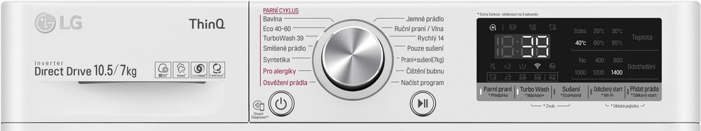 Slouží k němu LED displej a volič programů s kovovým povrchem. Vybírat můžete ze 14 programů, mezi nimiž nechybí speciální programy Sportovní oblečení, Jemná péče nebo třeba Ruční praní / Vlna. Součástí výbavy pračkosušičky je také parní technologie Steam™ s programy Osvěžení prádla a Pro alergiky, který odstraní z oblečení až 99,9 % alergenů. Samozřejmostí jsou klasické programy Bavlna, Syntetika či Smíšené prádlo. Určitě využijete také 5 programů sušení – Normální Eco, Sušení na nižší teplotu, Suché k žehlení, Do skříně (Normální) a Eco Hybrid. Prostřednictvím aplikace LG ThinQ si pak můžete stáhnout další programy nebo spotřebič na dálku zapnout.