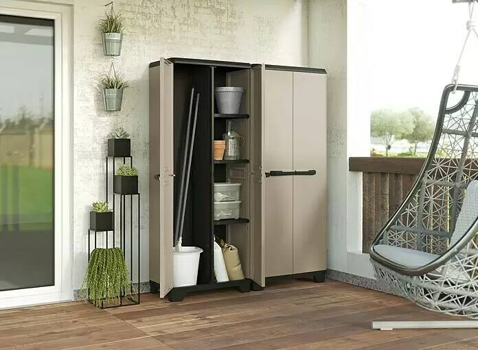 Plastová skříň je vyrobena z 80 % recyklovaného plastu a je vhodná pro širokou škálu použití. Skříňka vhodná do interiéru má tři police s nosností 15 kg každá a je uzavíratelná dvěma dvířky. Jednoduchý zásuvný systém umožňuje rychlou montáž bez použití nářadí.