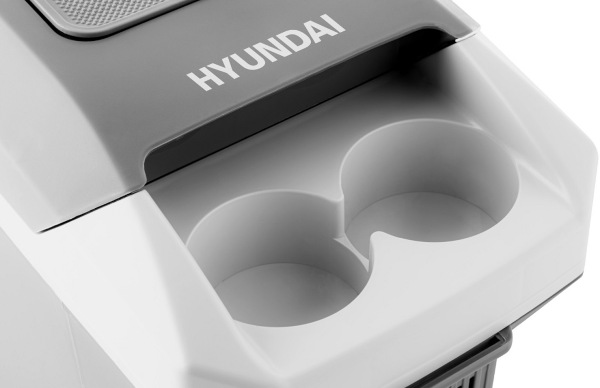 K dispozici vám bude délkově nastavitelný popruh pro snazší nošení. Hyundai HYUMC08 nabízí také odkládací prostor s protiskluzovou plochou na drobnosti. Do dvou otvorů ve víku můžete umístit například lahve, kelímky nebo další drobnosti.