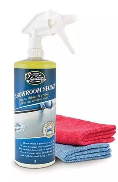 Greased Lightning Showroom Shine je moderní přípravek, který umožňuje umývat a voskovat vozidla bez použití vody. Celý proces zvládnete za méně než 30 minut a nepotřebujete k tomu žádné hadice, šampony ani kbelíky. Stačí sprej a dvě utěrky z mikrovlákna – produkt účinně odstraní špínu, hmyz, dehet i mastnotu z laku, plastů, skla a kovových částí. Výsledkem je čistý a lesklý povrch, který zároveň chrání karoserii.