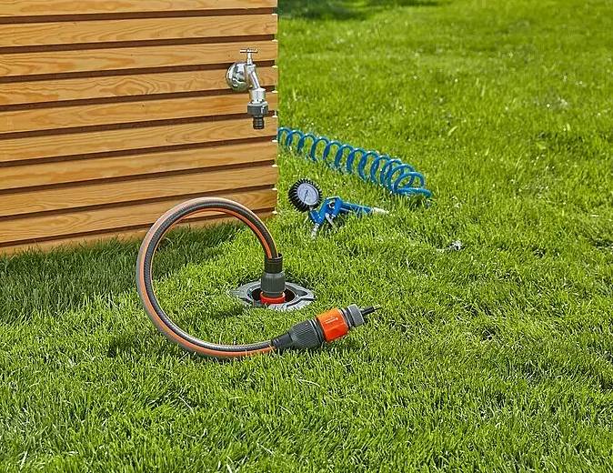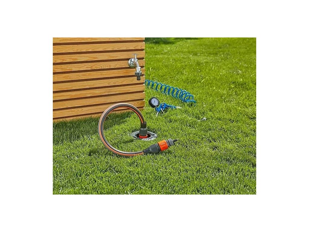 Připojovací box Gardena se používá k připojení vodovodního kohoutku k podzemnímu systému Gardena Sprinklersystem nebo ke Gardena potrubí. Pokud je ventil nebo vodní zásuvka připojena po proudu, je hadicová přípojka pod konstantním tlakem; v tomto případě musí být hadicová přípojka zajištěna nástavcem tak, aby byla odolná proti tlaku.