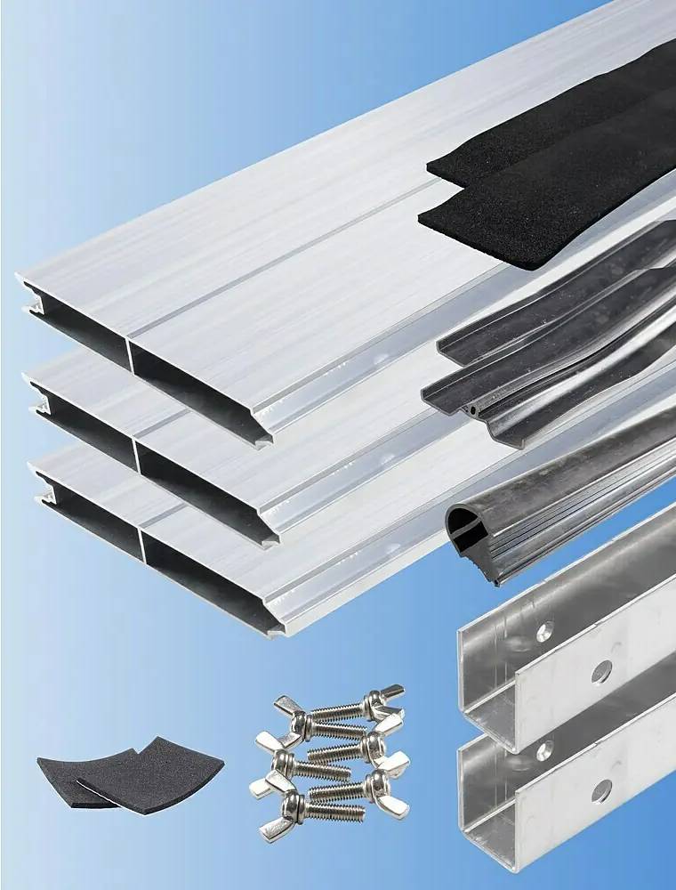 - 2× hliníkový nástěnný pás, 3× hliníkový profil duté komory 1,2 m, 2× koncová podložka, 2× meziprofil, 2× těsnící páska, 1× koncový profil, 6× křídlový šroub