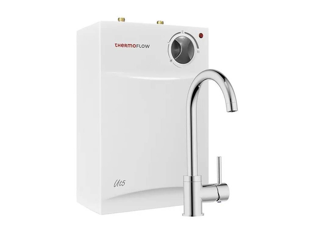 Zásobník pod desku Thermoflow UT 5 splní vaše nejvyšší požadavky na ekonomický komfort. Otevřená (beztlaká) instalace smí být provedena pouze s nízkotlakými armaturami. Sladěná baterie Ovalis je součástí balení a je ideální pro kuchyňské dřezy. Díky svému vysokému výkonu se voda ohřeje v krátké době. Termostat lze nastavit až na 75 °C pomocí regulace teploty.