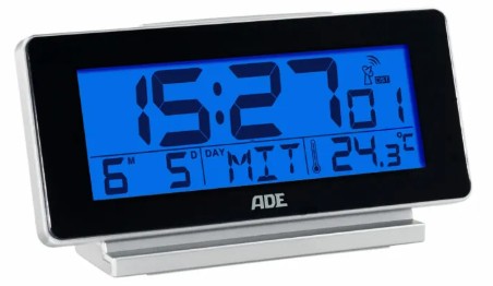 Tlačítko odložení na digitálních rádiem řízených hodinách ADE CK 1703-2 je extra velké a zvyšuje přesnost pro ty, kteří chtějí po probuzení chvíli odložit. Pro přehled o novém dni zobrazuje radiobudík také vnitřní teplotu (ve °C a °F) a také datum a den v sedmi jazycích (DE, EN, ES, FR, IT, NL, DA). Časový signál stolních hodin je přijímán přes DCF, takže přepínání mezi letním a zimním časem je automatické. Velmi pohodlné: Osvětlení displeje na jasné LCD obrazovce lze ručně zapnout jednoduchým stisknutím tlačítka. To šetří energii ve srovnání s nepřetržitým osvětlením a v noci neprosvětluje místnost, což zajišťuje příjemnější spánek.