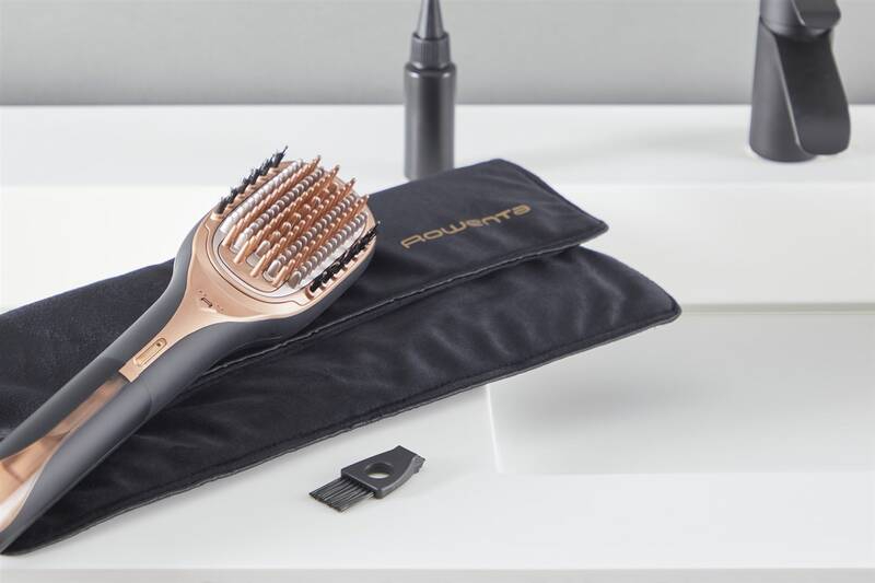 Krásný lesk vlasů zajišťuje keratinový povrch a přirozené štětiny kartáče. Velmi snadné použití díky rychlému nahřátí do 60 vteřin, velké nádobce na vodu, která vydrží až 5 použití bez nutnosti doplnění vody a funkce automatického vypnutí po 60 minutách nečinnosti. Součástí balení je také krásné sametové pouzdro na uložení přístroje po použití, kartáček na čištění a láhev demineralizované vody.